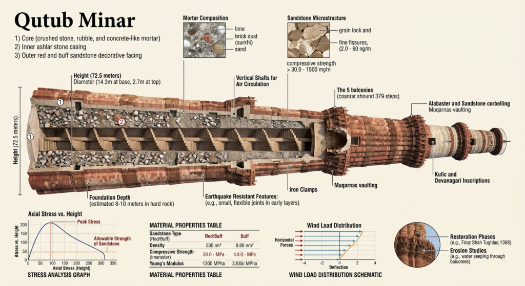 कुतुब मीनार की सबसे बड़ी खासियत इसकी ज्यामितीय सटीकता (Geometric Precision) है। मीनार नीचे से चौड़ी (14.3 मीटर) है और ऊपर जाते-जाते संकरी (2.7 मीटर) होती जाती है।